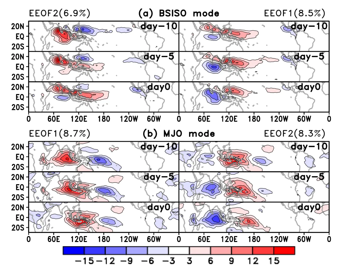 第二模态(EOF2)具有三极对流模式,增强的对流具有倾斜结构,从印度大陆向东南延伸至赤道西太平洋,并伴有强烈的低层风辐合(图1b)。这两个模态共同呈现出传播模式,当EOF1模态(PC1)的时间序列领先EOF2模态(PC2)的时间序列13天时,二者达到最高的正相关性(Lee等,2013)。