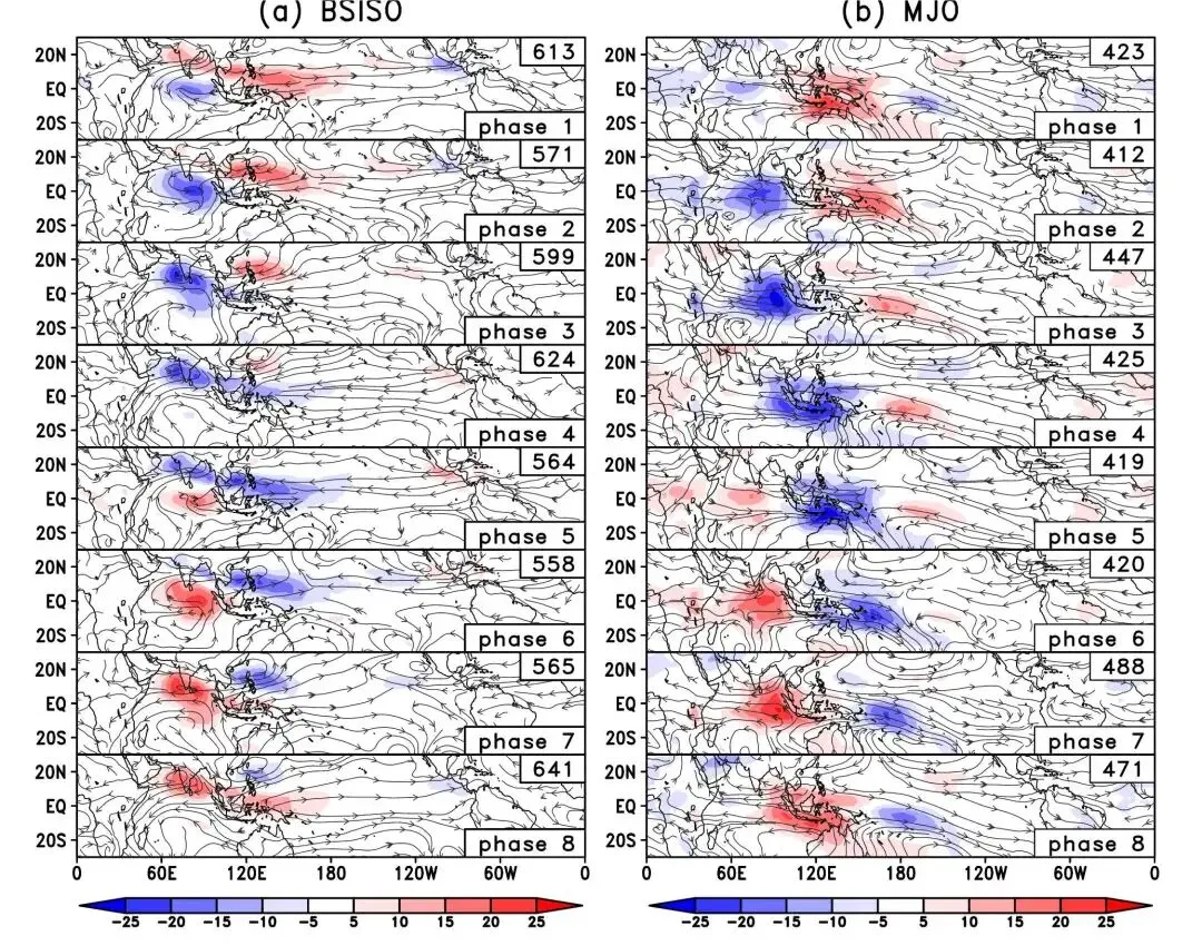 - 典型周期:BSISO的平均周期约为40-50天。早期夏季周期较短(约40天),晚期夏季可能延长至约50天。