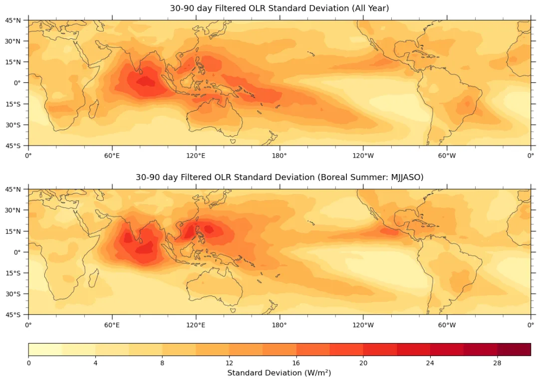 进入北半球夏季后,强变率区更偏向:西太—印度洋(对应 BSISO/季风季节内振荡 的活跃区域)
