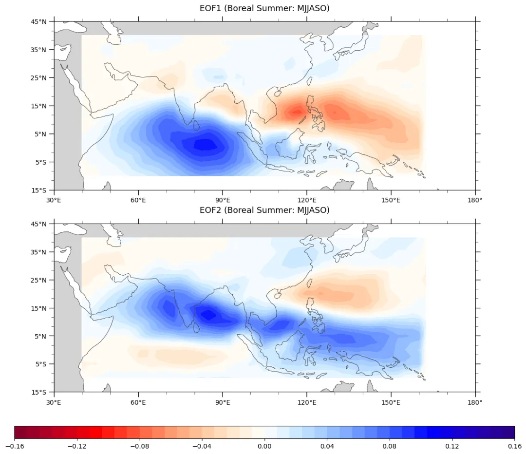 进一步的,根据上述EOF的区域,进行复现。对于EOF的pattern我感觉还是相对一致的,对于解释方差我这里得到的第一/第二EOF分别是:16.7% , 11.1%。相比文献中的要强了不少,想了一下和文献中处理的不同的地方