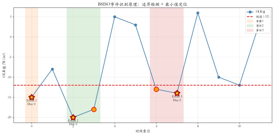 - 2、对于滤波后的异常场,选择赤道东印度洋(EIO;5°S 至 10°N,80° 至 100°E),计算区域平均,得到平均的一条时间序列。提取每年的5-10月数据,如果区域平均异常场小于其负一倍的标准偏差(-1*SD),则该天定义为一个BSISO事件。事件第 0 天定义为季节内 OLR 异常达到最小值的点。