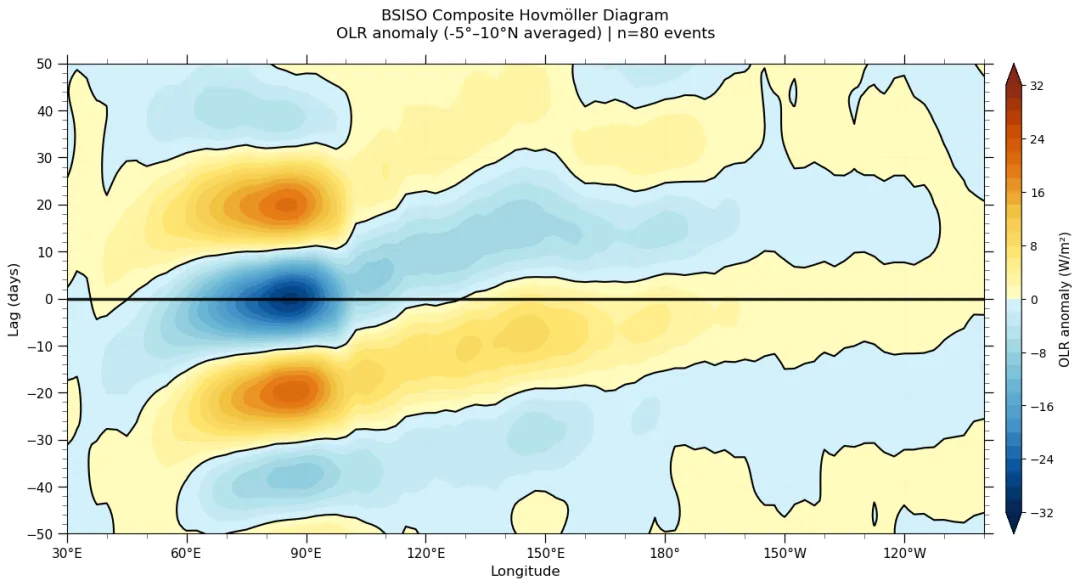 - 复杂传播路径:与冬季MJO主要沿赤道东传不同,BSISO的对流活动表现出更复杂的时空演变: