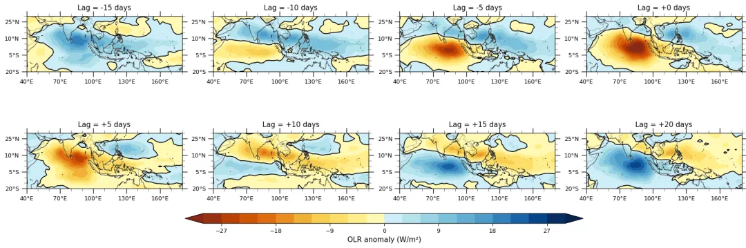 - 1、对OLR数据去除气候态季节日循环,然后进行带通滤波,30-90天