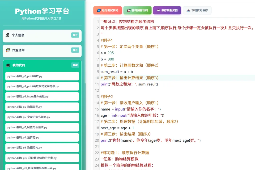 # 第一步:接收用户输入(顺序1)name = input("请输入你的名字:")age = int(input("请输入你的年龄:"))# 第二步:处理数据(计算明年年龄,顺序2)next_age = age + 1# 第三步:输出结果(顺序3)print(f"你好{name},你今年{age}岁,明年{next_age}岁。")#输出:你好XXX,你今年18岁,明年19岁。