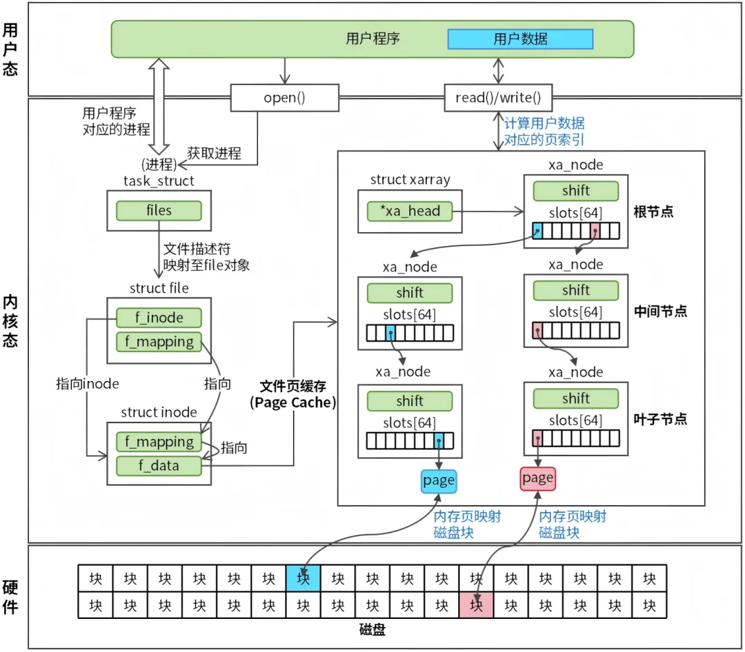 文件页缓存通过 Xarray 结构来管理内存页,struct address_space 结构定义了一个 i_pages 成员(struct xarray 结构) ,Xarray 是 Linux 内核 4.20+ 引入的高效的键值存储结构,用来替代老旧的 Radix Tree。