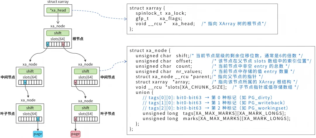 树节点结构为struct xa_node,定义如下:structxa_node {unsignedchar shift; /* 当前节点层级的剩余位移位数,通常是6的倍数 */unsignedchar offset; /* 该节点在父节点 slots 数组中的索引位置*/unsignedchar count; /* 当前节点中非空 entry 的总数 */unsignedchar nr_values; /* 当前节点中存储的值 entry 数量 */structxa_node __rcu *parent; /* 指向父节点的指针 */structxarray *array;/* 指向该节点所属的 Xarray 根结构 */void __rcu *slots[XA_CHUNK_SIZE]; /* 子节点指针或值存储数组 */union {// tags[0][0]: bit0-bit63 → 第 0 种标记(如 PG_dirty)// tags[1][0]: bit0-bit63 → 第 1 种标记(如 PG_writeback)// tags[2][0]: bit0-bit63 → 第 2 种标记(如 PG_workingset)unsignedlong tags[XA_MAX_MARKS][XA_MARK_LONGS];unsignedlong marks[XA_MAX_MARKS][XA_MARK_LONGS]; };};