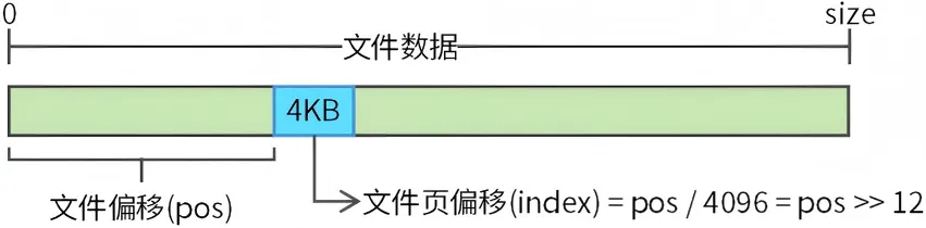 假如文件偏移(pos)为38964650字节,文件页偏移(index)为9512(38964650 >> 12)。