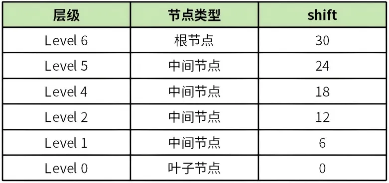shift的作用是计算文件页偏移(index)在当前节点的slots槽位索引(offset),计算公式为:offset = (index >> shift) & (64 - 1) 。