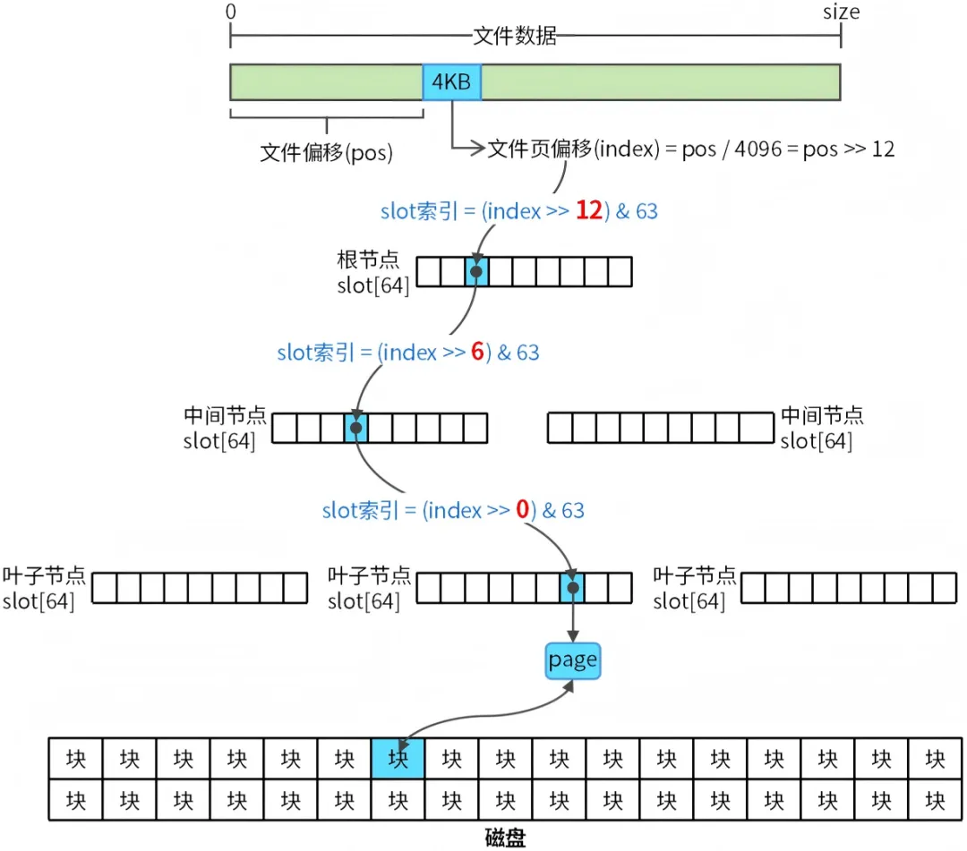 叶子节点shift为0,槽位索引offset为40(000010 010100 101000 & 63),slots[40]指向page地址,page对应的物理页存储的就是文件数据。