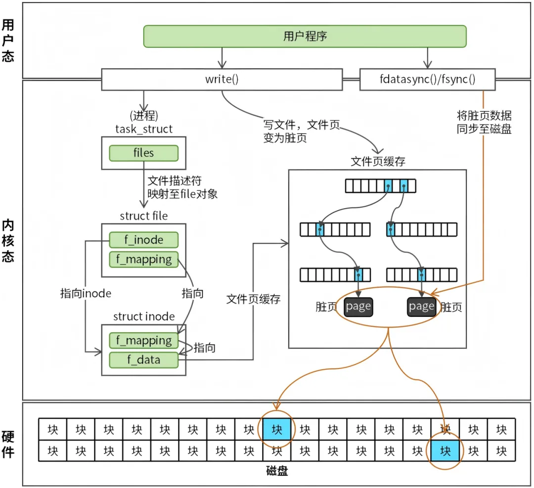 直接I/O:通过 O_DIRECT 标志打开文件,绕过页缓存直接将数据写入磁盘。