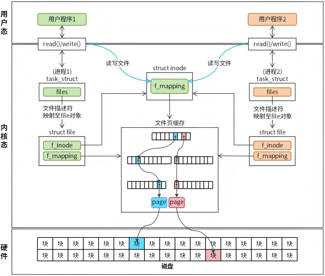 进程打开一个文件时,内核会创建一个 file 对象,内核会将 inode 的 i_mapping 赋值给 file 对象的 f_mapping(struct address_space 结构),这样新打开的文件就能够访问文件页缓存了。值得注意的是:多个进程打开同一个文件时,每个 file 对象的 f_mmaping 都会指向相同的 i_mapping。