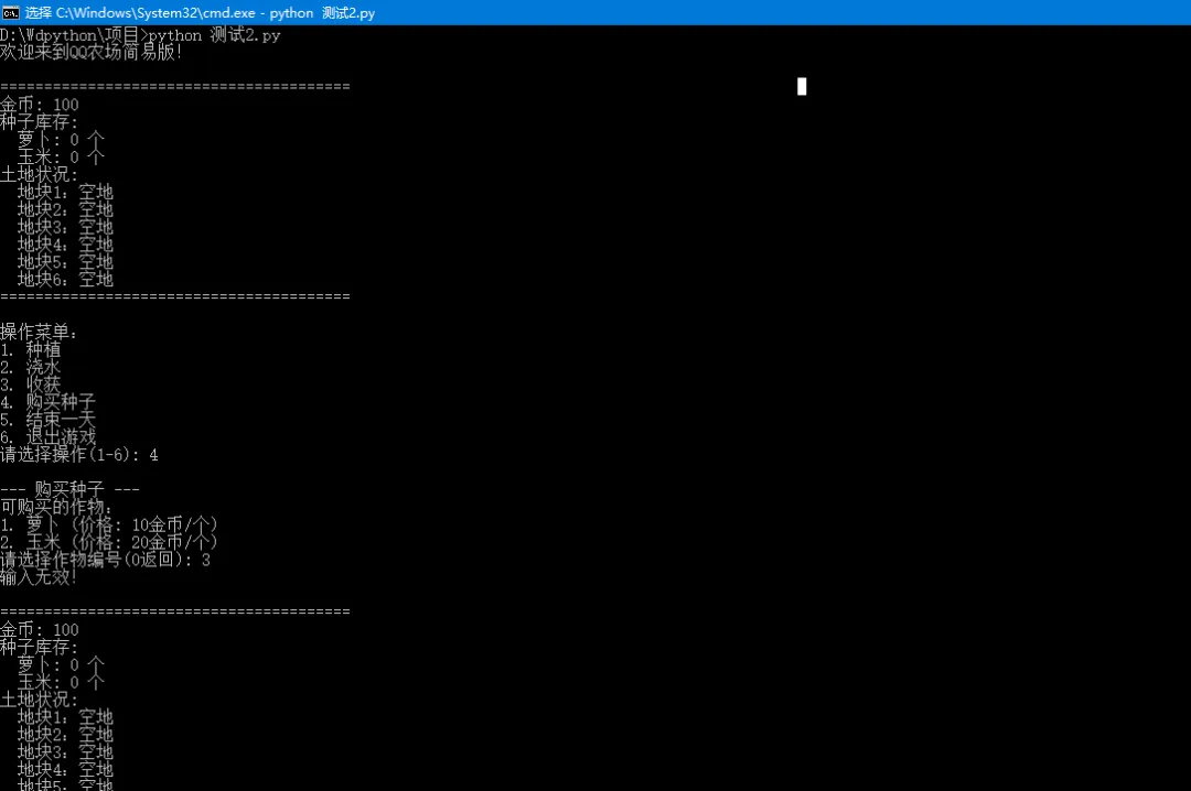下面是一个用 Python 实现的简化版“QQ农场”种菜游戏。采用回合制(每天结束时作物生长一次),包含种植、浇水、收获、购买种子等基本功能,运行在命令行界面。