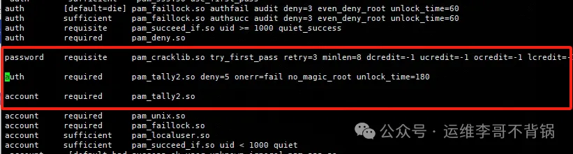 # 修改前备份cp /etc/pam.d/system-auth /etc/pam.d/system-auth.bak# 修改配置vim /etc/pam.d/system-auth# 没有则新增password requisite pam_cracklib.so try_first_pass retry=3 minlen=8 dcredit=-1 ucredit=-1 ocredit=-1 lcredit=-1 配置参数说明:# 配置说明retry= 3 # 在返回失败前允许3次尝试。minlen = 8 # 密码必须是8个字符或更多dcredit = - 1 # 提供至少1位数字ucredit = - 1 # 提供至少一个大写字符ocredit = - 1 # 提供至少一个特殊字符lcredit = - 1 # 提供至少一个小写字符vim /etc/pam.d/system-auth# 增加如下内容:输入错误5次,锁定180sauth required pam_tally2.so deny=5 onerr=fail no_magic_root unlock_time=180 account required pam_tally2.so