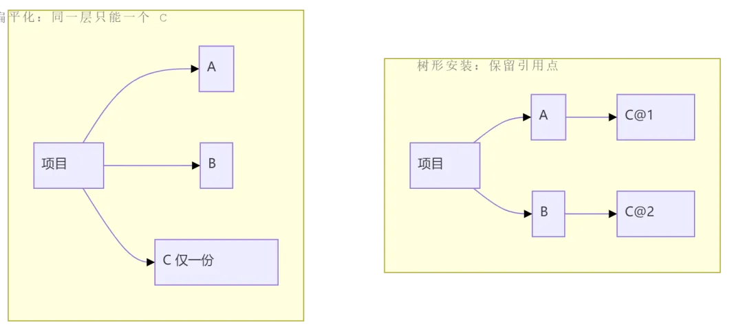 ·扁平化(丢失引用点)安装器把依赖“提升”到同一层(如都放到 项目/node_modules 下),同一包名在同一层只能出现一个版本。于是:要么只保留 C@1 或 C@2 之一,必有一方拿错版本;要么放弃扁平、部分保留嵌套,但树变深、重复多份。同时,顶层对项目根代码可见,项目若误用未声明的包(本应是某依赖的传递依赖),也能被解析到——即幽灵依赖。因此,扁平化既无法正确表达“同一包多版本”,又制造了“未声明却可用”的可见性。