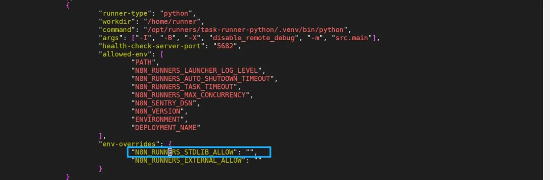 # 停用之前的n8n,不要删除volumedocker stop n8ndocker rm n8n# 创建文件夹mkdir n8ncd n8ntouch docker-compose.ymltouch n8n-task-runners.jsonservices:n8n:image:n8nio/n8n:latestcontainer_name:n8n-mainenvironment:-N8N_RUNNERS_MODE=external-N8N_NATIVE_PYTHON_RUNNER=true-N8N_ENABLE_EXECUTE_COMMAND=true-N8N_RUNNERS_BROKER_LISTEN_ADDRESS=0.0.0.0-N8N_RUNNERS_AUTH_TOKEN=your-secret-here-N8N_DEFAULT_LOCALE=zh-CN-N8N_SECURE_COOKIE=false-GENERIC_TIMEZONE="Asia/Shanghai"-TZ="Asia/Shanghai"ports:-"5678:5678"volumes:-n8n_data:/home/node/.n8n-~/dist:/usr/local/lib/node_modules/n8n/node_modules/n8n-editor-ui/disttask-runners:image:n8nio/runners:latestcontainer_name:n8n-runnersenvironment:-N8N_RUNNERS_TASK_BROKER_URI=http://n8n-main:5679-N8N_RUNNERS_AUTH_TOKEN=your-secret-here# 允许引用Python标准库-N8N_RUNNERS_STDLIB_ALLOW=*volumes:# 挂载配置文件,默认情况下不会识别N8N_RUNNERS_STDLIB_ALLOW这个环境变量-./n8n-task-runners.json:/etc/n8n-task-runners.jsondepends_on:-n8nvolumes:n8n_data:# 默认会创建带n8n前缀的新卷# 如果要引用之前创建的卷,取消下面的注释# external: true{"task-runners": [ {"runner-type": "javascript","workdir": "/home/runner","command": "/usr/local/bin/node","args": ["--disallow-code-generation-from-strings","--disable-proto=delete","/opt/runners/task-runner-javascript/dist/start.js" ],"health-check-server-port": "5681","allowed-env": ["PATH","GENERIC_TIMEZONE","NODE_OPTIONS","N8N_RUNNERS_AUTO_SHUTDOWN_TIMEOUT","N8N_RUNNERS_TASK_TIMEOUT","N8N_RUNNERS_MAX_CONCURRENCY","N8N_SENTRY_DSN","N8N_VERSION","ENVIRONMENT","DEPLOYMENT_NAME","HOME" ],"env-overrides": {"NODE_FUNCTION_ALLOW_BUILTIN": "crypto","NODE_FUNCTION_ALLOW_EXTERNAL": "moment","N8N_RUNNERS_HEALTH_CHECK_SERVER_HOST": "0.0.0.0" } }, {"runner-type": "python","workdir": "/home/runner","command": "/opt/runners/task-runner-python/.venv/bin/python","args": ["-I", "-B", "-X", "disable_remote_debug", "-m", "src.main"],"health-check-server-port": "5682","allowed-env": ["PATH","N8N_RUNNERS_LAUNCHER_LOG_LEVEL","N8N_RUNNERS_AUTO_SHUTDOWN_TIMEOUT","N8N_RUNNERS_TASK_TIMEOUT","N8N_RUNNERS_MAX_CONCURRENCY","N8N_SENTRY_DSN","N8N_VERSION","ENVIRONMENT","DEPLOYMENT_NAME","N8N_RUNNERS_STDLIB_ALLOW" ],"env-overrides": {"N8N_RUNNERS_EXTERNAL_ALLOW": "" } } ]}