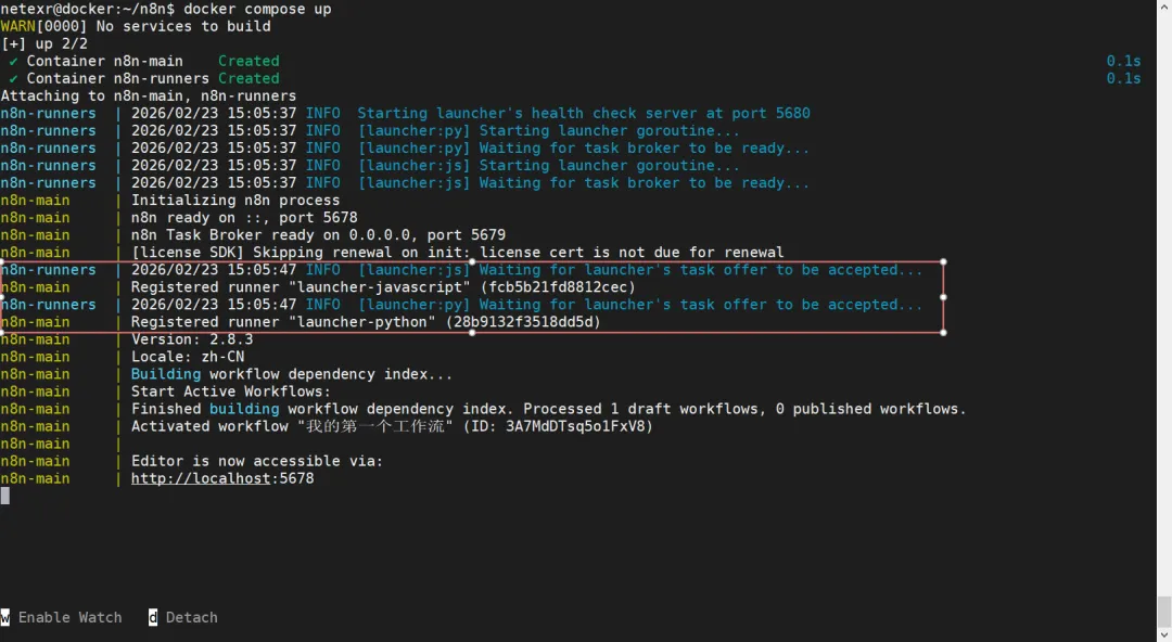 # 启动容器docker compose up# 查看日志无报错之后,按d转入后台# 后续观察日志docker compose logs -f n8n