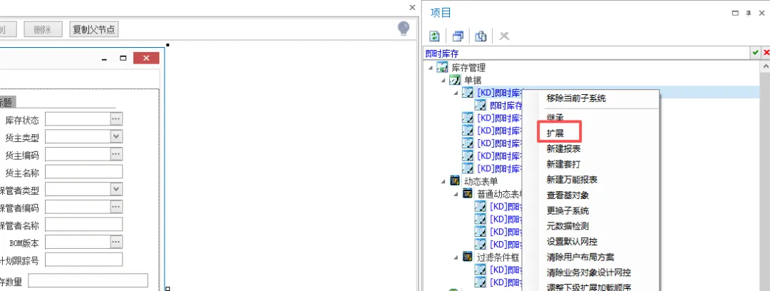 1、打开BOS设计器,找到需要修改的单据,如果单据是只读状态,不要慌!只需在单据上右键点击【扩展】,就能以可编辑模式打开