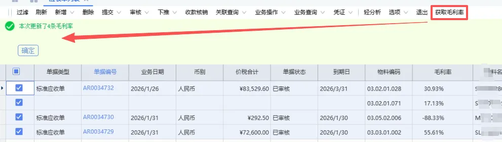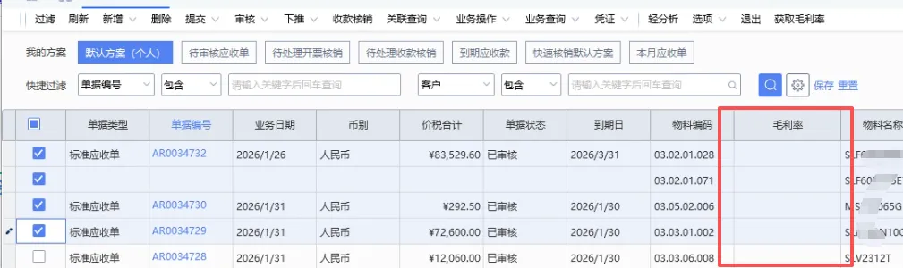 3.1 打开应收单列表,勾选需要获取的明细毛利率,当然不勾选则获取半年内毛利率,如下图: