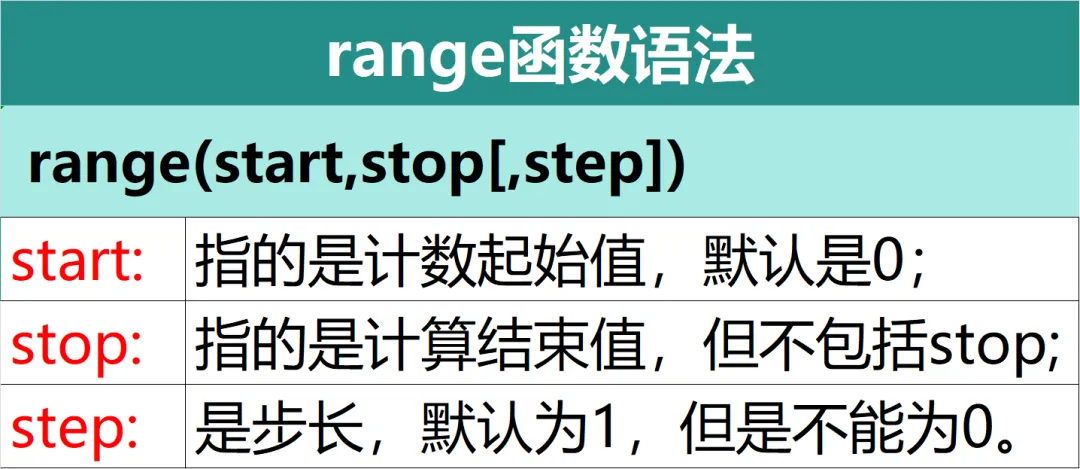start(起始值)就是你数数的 “起点”。这个参数可以不写,不写的话默认从 0 开始数。比如只写range(5),就默认从 0 开始数。