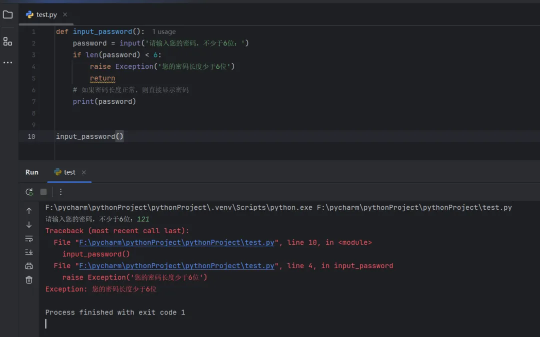 def input_password(): password = input('请输入您的密码,不少于6位:') iflen(password) < 6: raise Exception('您的密码长度少于6位') return # 如果密码长度正常,则直接显示密码 print(password)input_password()