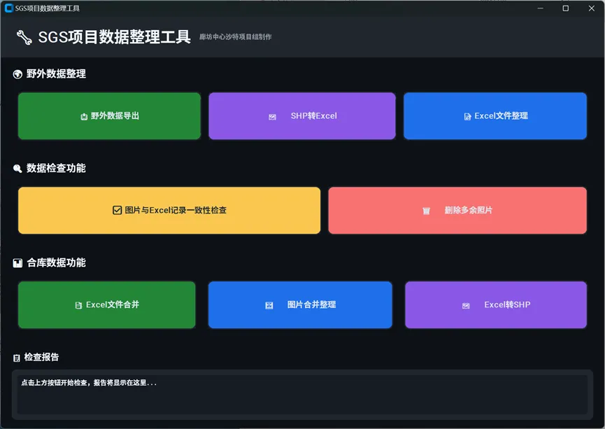 SGS 项目数据整理工具把野外数据导出、Excel 与 SHP 互转、多表合并、照片分拣、表头统一、记录与照片对账、多余照片清理集中在一个窗口里,适合作为项目每周合库、交成果前的标准化数据处理工具。
