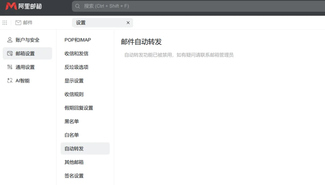 ❌ “抱歉,出于安全考虑,企业管理员已禁用邮件自动转发功能。”