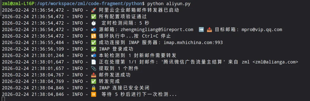 import imaplibimport smtplibimport sslimport timeimport jsonimport loggingimport emailfrom email.utils import formatdate, parseaddrfrom email.header import decode_header# ==========================# 第一步:配置你的专属参数# ==========================IMAP_HOST = "imap.mxhichina.com" # 阿里云IMAP服务器(其他邮箱请自行更改)SMTP_HOST = "smtp.mxhichina.com" # 阿里云SMTP服务器EMAIL_ACCOUNT = "your-enterprise@yourdomain.com" # 你的企业邮箱账号EMAIL_PASSWORD = "your-app-password" # 邮箱密码 或 应用专用密码(强烈建议使用应用密码)TARGET_EMAIL = "your-personal-email@qq.com" # 接收转发的个人主邮箱(如QQ邮箱)CHECK_INTERVAL = 5 # 轮询间隔(秒),即每5秒检查一次新邮件UID_STORE_FILE = "forwarded_uids.json" # 本地记录已转发邮件的记忆文件# ==========================# 日志配置(让你清楚看到代码在干嘛)# ==========================logging.basicConfig( level=logging.INFO, format="%(asctime)s - %(levelname)s - %(message)s")# --- 以下为核心处理逻辑,新手无需修改,直接运行即可 ---# ==========================# UID 持久化# ==========================def load_forwarded_uids(): try: with open(UID_STORE_FILE, "r") as f: return set(json.load(f)) except: return set()def save_forwarded_uids(uids): with open(UID_STORE_FILE, "w") as f: json.dump(list(uids), f)# ==========================# IMAP 操作# ==========================def connect_imap(first_connect=False): mail = imaplib.IMAP4_SSL(IMAP_HOST, 993) if first_connect: logging.info(f"✅ 成功连接到 IMAP 服务器: {IMAP_HOST}:993") mail.login(EMAIL_ACCOUNT, EMAIL_PASSWORD) if first_connect: logging.info("✅ IMAP 登录成功") mail.select("INBOX", readonly=True) return maildef fetch_unseen_uids(mail): status, response = mail.uid("search", None, "UNSEEN") if status != "OK": return [] return response[0].split()def fetch_raw_email(mail, uid): status, data = mail.uid("fetch", uid, "(BODY.PEEK[])") if status != "OK": return None return data[0][1]# ==========================# 邮件解析# ==========================def decode_mime_words(text): decoded = "" for part, encoding in decode_header(text): if isinstance(part, bytes): decoded += part.decode(encoding or "utf-8", errors="ignore") else: decoded += part return decodeddef parse_email_info(raw_email_bytes): msg = email.message_from_bytes(raw_email_bytes) subject = decode_mime_words(msg.get("Subject", "")) name, addr = parseaddr(msg.get("From", "")) if name: name = decode_mime_words(name) from_display = f"{name} <{addr}>" else: from_display = addr return subject, from_displaydef count_attachments(raw_email_bytes): msg = email.message_from_bytes(raw_email_bytes) count = 0 for part in msg.walk(): if part.get_content_disposition() == "attachment": count += 1 return count# ==========================# Resent 转发,核心逻辑:伪装成系统重发,保持邮件排版不乱!# ==========================def build_resent_message(raw_email_bytes): split_index = raw_email_bytes.find(b"\r\n\r\n") if split_index == -1: return None original_headers = raw_email_bytes[:split_index] original_body = raw_email_bytes[split_index:] # 注入 Resent 协议头,实现无损转发 resent_headers = ( f"Resent-From: {EMAIL_ACCOUNT}\r\n" f"Resent-To: {TARGET_EMAIL}\r\n" f"Resent-Date: {formatdate(localtime=True)}\r\n" f"Sender: {EMAIL_ACCOUNT}\r\n" ).encode("utf-8") return resent_headers + original_headers + original_bodydef send_raw_email(raw_message): context = ssl.create_default_context() try: with smtplib.SMTP(SMTP_HOST, 587) as server: server.starttls(context=context) server.login(EMAIL_ACCOUNT, EMAIL_PASSWORD) server.sendmail(EMAIL_ACCOUNT, TARGET_EMAIL, raw_message) logging.info("📤 邮件发送成功") return True except Exception as e: logging.error(f"❌ 邮件发送失败: {e}") return False# ==========================# 主程序# ==========================def main(): logging.info("🚀 阿里云企业邮箱邮件转发器已启动") if not all([IMAP_HOST, SMTP_HOST, EMAIL_ACCOUNT, EMAIL_PASSWORD, TARGET_EMAIL]): logging.error("❌ 配置项缺失") return logging.info("✅ 所有配置项验证通过") logging.info(f"⏱️ 定时检测间隔: {CHECK_INTERVAL} 秒") logging.info(f"📬 源邮箱: {EMAIL_ACCOUNT} ➡️ 📤 目标邮箱: {TARGET_EMAIL}") logging.info("🔁 循环执行中...按 Ctrl+C 停止") forwarded_uids = load_forwarded_uids() first_connect = True try: while True: try: mail = connect_imap(first_connect) first_connect = False all_uids = fetch_unseen_uids(mail) # 只过滤需要转发的 pending_uids = [ uid for uid in all_uids if uid.decode() not in forwarded_uids ] if pending_uids: logging.info(f"📬 本轮检测到 {len(pending_uids)} 封新邮件需要转发") else: mail.logout() time.sleep(CHECK_INTERVAL) continue for index, uid in enumerate(pending_uids, start=1): uid_str = uid.decode() raw_email = fetch_raw_email(mail, uid) if not raw_email: continue subject, from_display = parse_email_info(raw_email) logging.info( f"📄 正在处理第 {index}/{len(pending_uids)} 封邮件: " f"'{subject}' 来自 {from_display}" ) attachment_count = count_attachments(raw_email) logging.info(f"📎 提取到 {attachment_count} 个附件") resent_message = build_resent_message(raw_email) if not resent_message: logging.error("❌ 邮件解析失败") continue if send_raw_email(resent_message): forwarded_uids.add(uid_str) save_forwarded_uids(forwarded_uids) logging.info("✅ 转发完成") else: logging.error("📤 转发失败,跳过下一封") mail.logout() logging.info("🔒 IMAP 连接已安全关闭") except Exception as e: logging.error(f"❌ 本轮异常: {e}") logging.info(f"⏸️ 等待 {CHECK_INTERVAL} 秒后进行下一次检测...") time.sleep(CHECK_INTERVAL) except KeyboardInterrupt: logging.info("👋 用户中断,程序正常退出")if __name__ == "__main__": main()