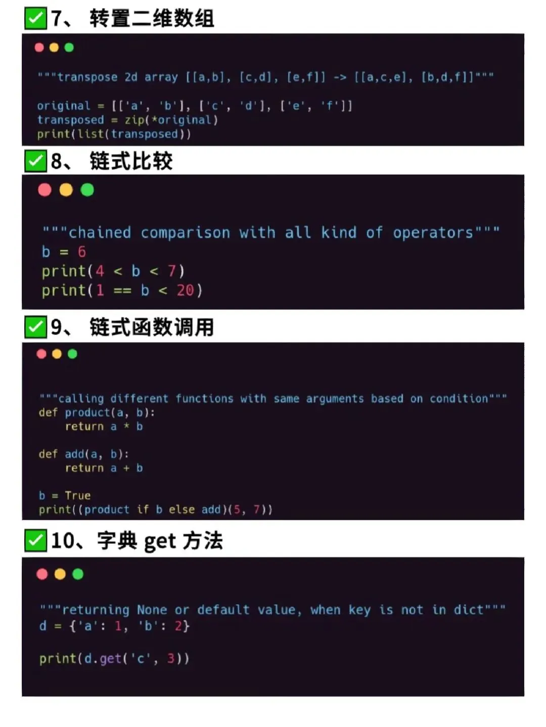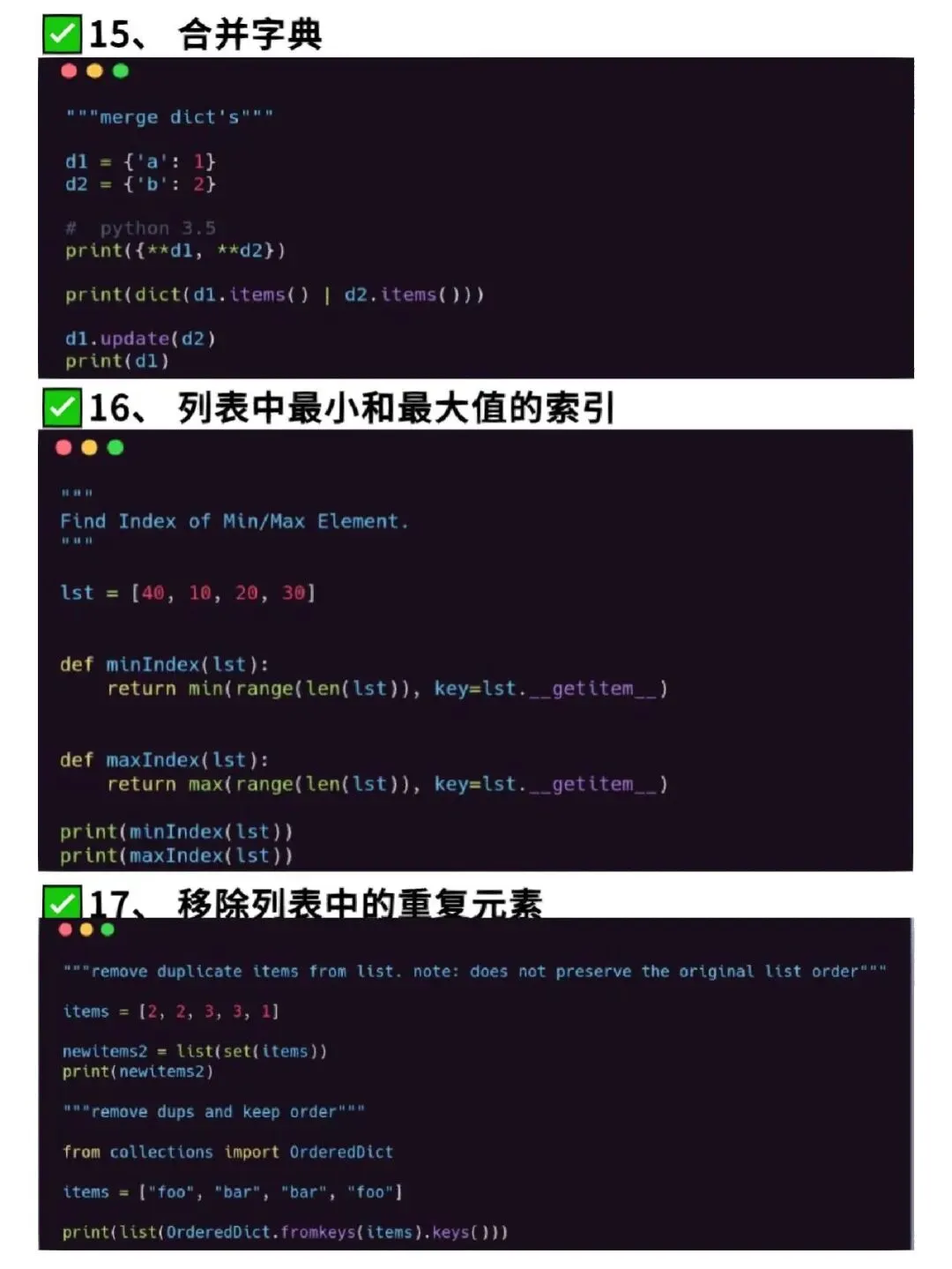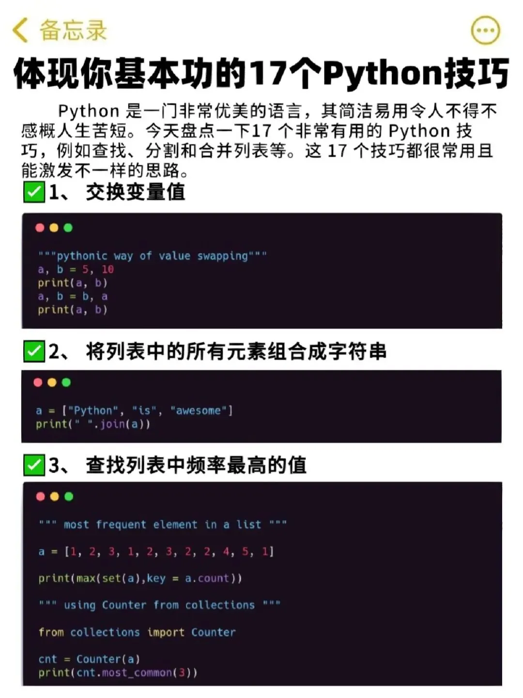 🌈Python 是一门十分优雅的语言,简洁好上手,难怪大家都说人生苦短,我用 Python~✅今天给大家整理了17 个超实用的 Python 实操技巧,比如列表查找、拆分与合并等。这 17 个技巧日常高频使用,还能帮你打开新的编程学习思路。
