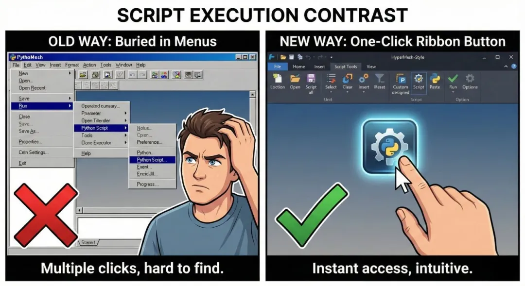 不要让你的代码“锦衣夜行”。通过 Extension 插件机制,你可以将 Python 脚本与 HyperMesh 的 Ribbon UI 完美融合。XML 负责长相,Python 负责灵魂。这不仅提升了工具的易用性,更彰显了你的工程专业度。
