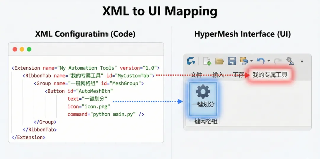 不要让你的代码“锦衣夜行”。通过 Extension 插件机制,你可以将 Python 脚本与 HyperMesh 的 Ribbon UI 完美融合。XML 负责长相,Python 负责灵魂。这不仅提升了工具的易用性,更彰显了你的工程专业度。