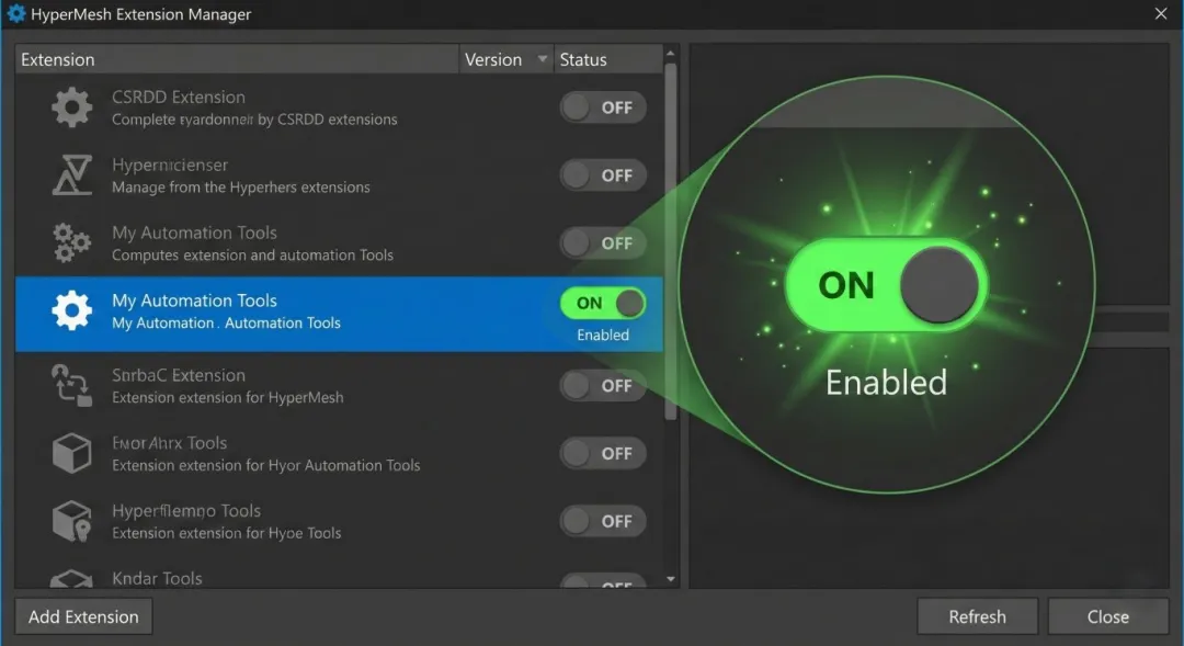 Python 与新架构的解法: HyperMesh 2026 引入了标准的 Extension (插件) 机制。你的脚本、图标和界面配置文件会被打包成一个独立的文件夹。只需在软件里“挂载”这个文件夹,属于你的专属菜单就会瞬间出现,即插即用,绿色无污染。