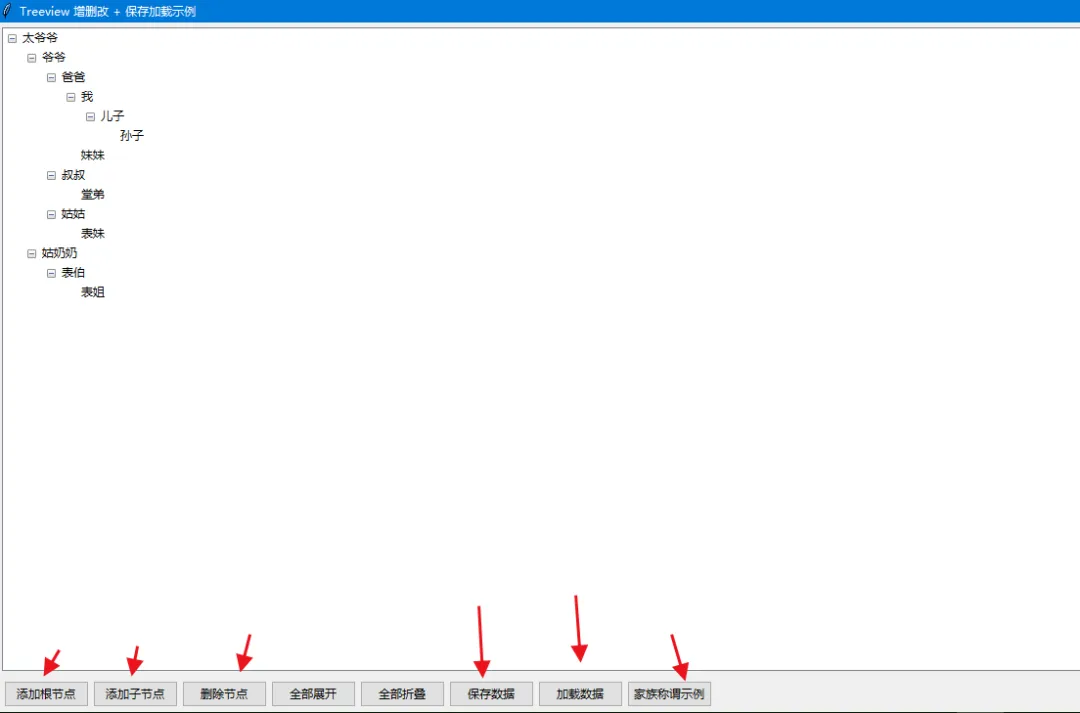 # -*- coding: utf-8 -*-# @Author : 小红牛# 微信公众号:wdPythonimport tkinter as tkfrom tkinter import ttk, simpledialog, messagebox, filedialogimport jsonclass TreeviewDemo:    def __init__(self, root):        self.root = root        self.root.title("Treeview 增删改 + 保存加载示例")        self.root.geometry("400x500")        # 创建 Treeview,隐藏标题栏        self.tree = ttk.Treeview(root, show='tree')        self.tree.pack(fill=tk.BOTH, expand=True, padx=5, pady=5)        # 插入初始数据(默认示例)        self.init_tree()        # 绑定双击事件(修改节点名称)        self.tree.bind('<Double-1>'self.on_double_click)        # 按钮框架        btn_frame = ttk.Frame(root)        btn_frame.pack(fill=tk.X, padx=5, pady=5)        ttk.Button(btn_frame, text="添加根节点", command=self.add_root_node).pack(side=tk.LEFT, padx=2)        ttk.Button(btn_frame, text="添加子节点", command=self.add_child_node).pack(side=tk.LEFT, padx=2)        ttk.Button(btn_frame, text="删除节点", command=self.delete_node).pack(side=tk.LEFT, padx=2)        ttk.Button(btn_frame, text="全部展开", command=self.expand_all).pack(side=tk.LEFT, padx=2)        ttk.Button(btn_frame, text="全部折叠", command=self.collapse_all).pack(side=tk.LEFT, padx=2)        ttk.Button(btn_frame, text="保存数据", command=self.save_tree).pack(side=tk.LEFT, padx=2)        ttk.Button(btn_frame, text="加载数据", command=self.load_tree).pack(side=tk.LEFT, padx=2)        # 标准家族树示例按钮(固定称谓)        ttk.Button(btn_frame, text="家族称谓示例", command=self.standard_family).pack(side=tk.LEFT, padx=2)    def init_tree(self):        """插入初始节点,全部展开"""        root_node = self.tree.insert('''end', text='我的电脑'open=True)        self.tree.insert(root_node, 'end', text='C盘'open=True)        self.tree.insert(root_node, 'end', text='D盘'open=True)        doc_node = self.tree.insert('''end', text='文档'open=True)        self.tree.insert(doc_node, 'end', text='工作报告.docx'open=True)        self.tree.insert(doc_node, 'end', text='照片.png'open=True)        self.expand_all()    # ---------- 增删改功能 ----------    def add_root_node(self):        new_name = simpledialog.askstring("添加根节点""请输入根节点名称:")        if new_name:            self.tree.insert('''end', text=new_name, open=True)    def add_child_node(self):        selected = self.tree.selection()        if not selected:            messagebox.showwarning("提示""请先选中一个父节点")            return        parent = selected[0]        new_name = simpledialog.askstring("添加子节点""请输入子节点名称:")        if new_name:            self.tree.insert(parent, 'end', text=new_name, open=True)    def delete_node(self):        selected = self.tree.selection()        if not selected:            messagebox.showwarning("提示""请先选中要删除的节点")            return        item = selected[0]        item_text = self.tree.item(item, 'text')        if messagebox.askyesno("确认删除"f"确定要删除节点 '{item_text}' 及其所有子节点吗?"):            self.tree.delete(item)    def on_double_click(self, event):        item = self.tree.identify_row(event.y)        if not item:            return        old_name = self.tree.item(item, 'text')        new_name = simpledialog.askstring("修改名称""请输入新的节点名称:", initialvalue=old_name)        if new_name and new_name != old_name:            self.tree.item(item, text=new_name)    def expand_all(self):        for item in self.tree.get_children():            self._expand_all(item)    def _expand_all(self, item):        self.tree.item(item, open=True)        for child in self.tree.get_children(item):            self._expand_all(child)    def collapse_all(self):        for item in self.tree.get_children():            self._collapse_all(item)    def _collapse_all(self, item):        self.tree.item(item, open=False)        for child in self.tree.get_children(item):            self._collapse_all(child)    # ---------- 保存和加载 ----------    def save_tree(self):        file_path = filedialog.asksaveasfilename(            defaultextension=".json",            filetypes=[("JSON files""*.json"), ("All files""*.*")]        )        if not file_path:            return        def collect_nodes(parent_id):            nodes = []            for child_id in self.tree.get_children(parent_id):                text = self.tree.item(child_id, 'text')                open_state = self.tree.item(child_id, 'open')                children = collect_nodes(child_id)                nodes.append({                    'text': text,                    'open': open_state,                    'children': children                })            return nodes        data = {'root_nodes': collect_nodes('')}        try:            with open(file_path, 'w', encoding='utf-8'as f:                json.dump(data, f, ensure_ascii=False, indent=2)            messagebox.showinfo("保存成功"f"树结构已保存到:{file_path}")        except Exception as e:            messagebox.showerror("保存失败"f"发生错误:{e}")    def load_tree(self):        file_path = filedialog.askopenfilename(            filetypes=[("JSON files""*.json"), ("All files""*.*")]        )     