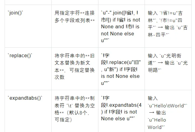 `join()` | 用指定字符**连接多个字段或列表** | `u"-".join([!省!, !市!]) if !省! is not None and !市! is not None else u""` | 输入 `!省!=u"吉林"`, `!市!=u"四平"` → 输出 `u"吉林-四平"` |
