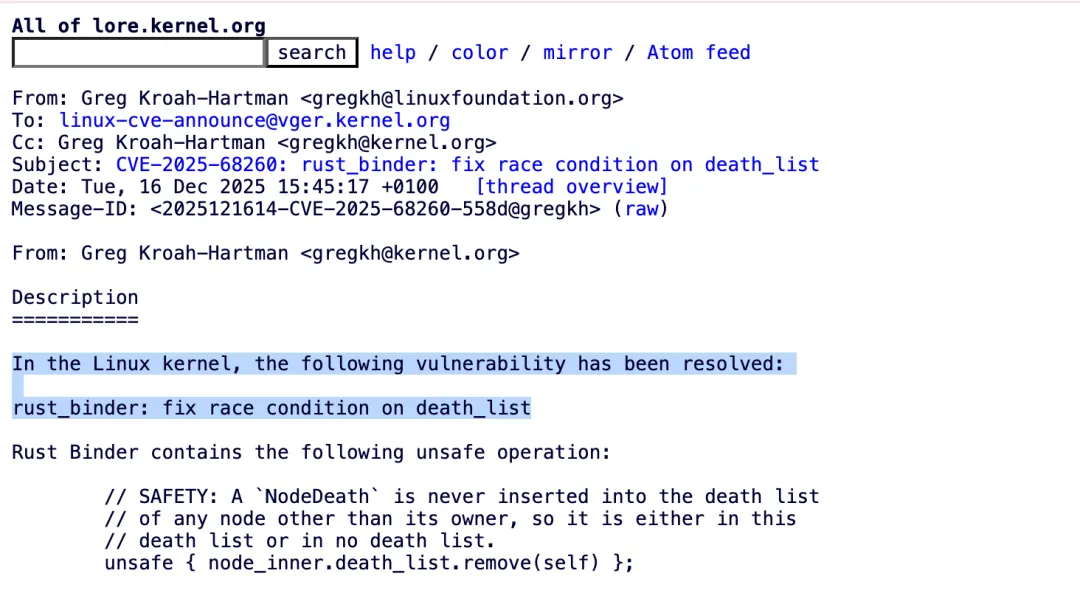 近日,Linux 内核维护者 Greg Kroah-Hartman 在邮件列表中确认,主线 Linux 内核中的一段 Rust 代码被正式登记为 CVE 漏洞。