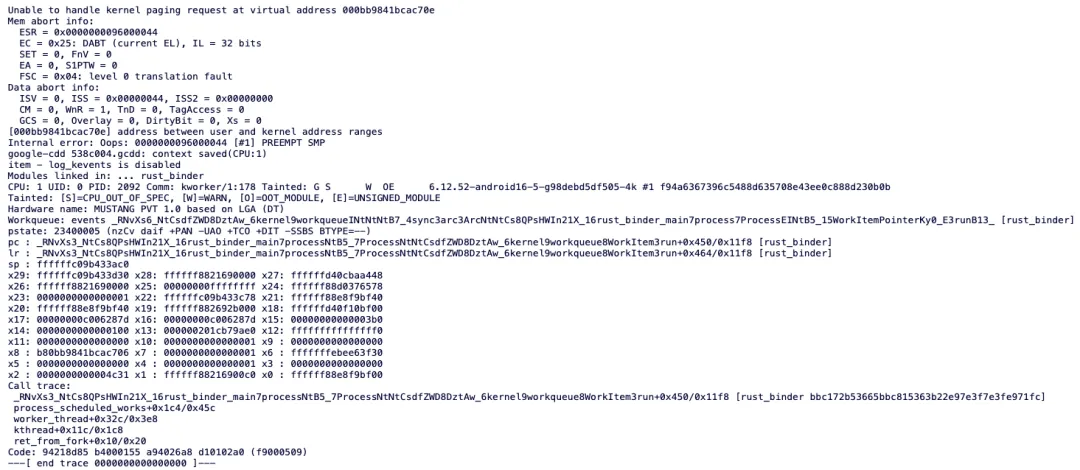 这一漏洞出现在用 Rust 重写的 Android Binder 驱动(rust_binder)中。由于其中包含被标注出来的 unsafe Rust 代码,在特定并发场景下可能触发竞态条件,导致链表中 prev/next 指针发生内存破坏,最终引发内核崩溃。