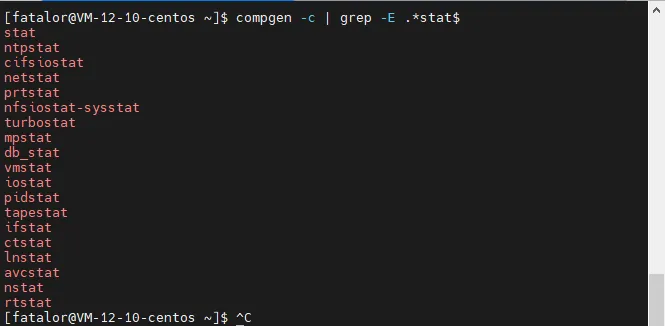 # 查找以“stat”子字符串结尾的所有命令[fatalor@VM-12-10-centos ~]$ compgen -c | grep -E .*stat$