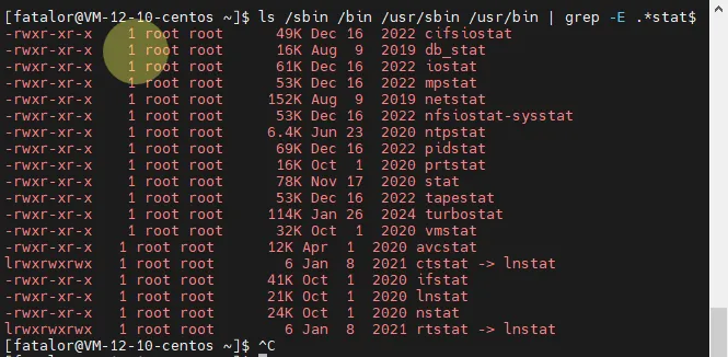 # 查找所有bin目录下以“stat”子字符串结尾的文件[fatalor@VM-12-10-centos ~]$ ls /sbin /bin /usr/sbin /usr/bin | grep -E .*stat$