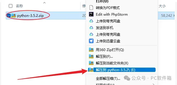 1.解压安装包:鼠标右击【python-3.5.2】压缩包,选择电脑上安装的解压软件,点击解压到【python-3.5.2】。