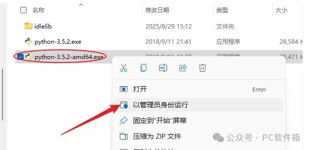 3.右键以管理员身份运行【python-3.5.2-amd64.exe】安装程序。