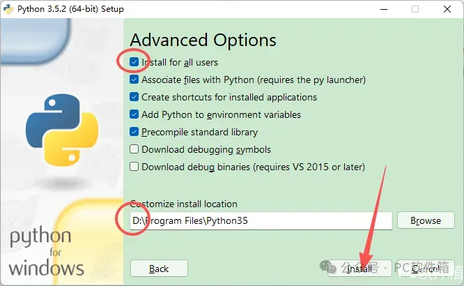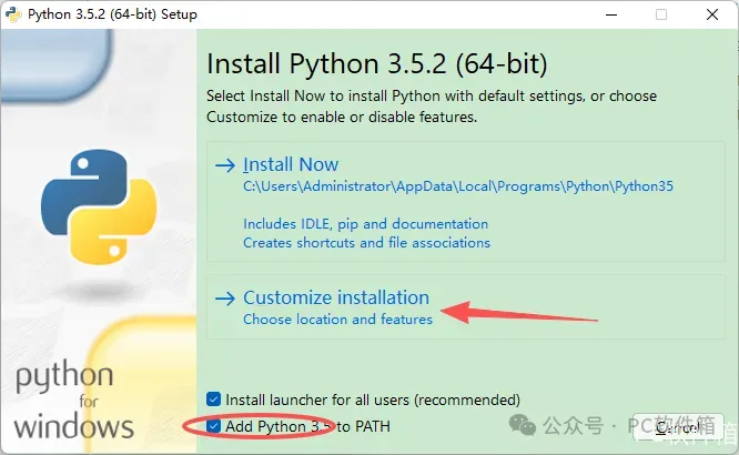 4.勾选【Add Python 3.5 to PATH】,点击【Customize installation】。