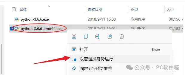 3.右键以管理员身份运行【python-3.6.6-amd64.exe】安装程序。