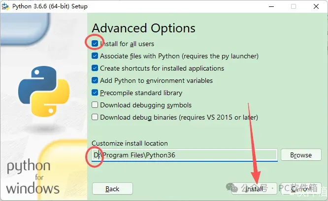6.勾选【Install Python……】,修改路径地址中的第一个字符C可更改安装位置(建议安装除C盘以外的其他盘,注:安装路径中不能有中文),点击【Install】。