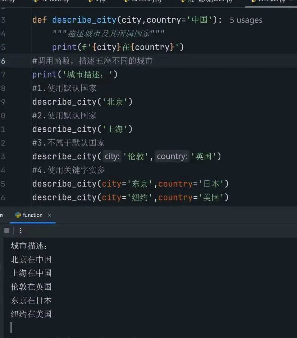 1.定义了一个函数,接受了两个参数city、country(默认值为“中国”)
