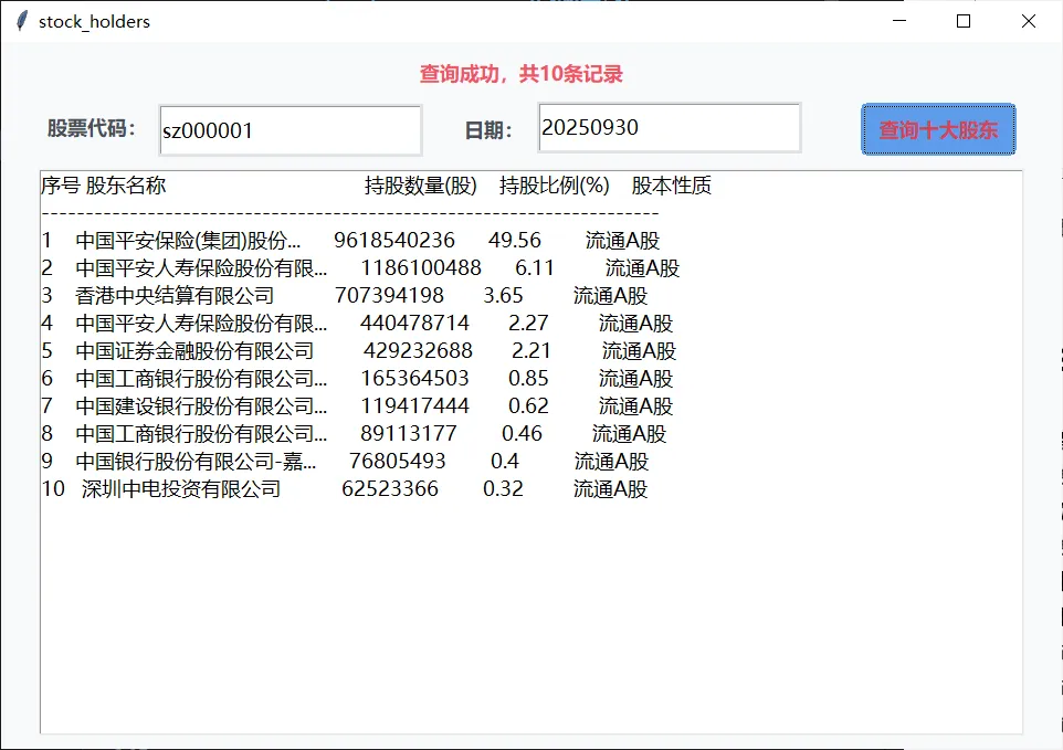 import akshare as ak# Form 'Form_1's Load Event :defForm_1_onLoad(uiName, threadings=0): Fun.SetText(uiName,"input_code","sz000001") Fun.SetText(uiName,"input_date","20250930")pass# Button 'button_query' 's Command Event :defbutton_query_onCommand(uiName, widgetName, threadings=0):# 1. 获取用户输入的股票代码和日期 code = Fun.GetText(uiName,"input_code").strip() date = Fun.GetText(uiName,"input_date").strip()ifnot code ornot date: Fun.SetText(uiName,"label_status","请输入股票代码和日期")return# 2. 更新状态 status_text = f"正在查询 {code} "if date: status_text += f" {date}" Fun.SetText(uiName,"label_status",status_text + "...")# 3. 执行查询try:# 调用 akshare 获取十大股东数据 df = ak.stock_gdfx_top_10_em(symbol=code, date=date)# 检查数据if df isNoneor df.empty: Fun.SetText(uiName,"label_status",f"未找到 {code} 的股东数据")return# 清空列表框 Fun.Clear(uiName,"listbox_holders")# 添加表头 Fun.AddLineText( uiName,"listbox_holders","序号 股东名称 持股数量(股) 持股比例(%) 股本性质", ) Fun.AddLineText(uiName,"listbox_holders","-" * 70)# 遍历数据并显示for index, row in df.iterrows():# 获取数据 rank = str(row.get("序号", index + 1)) name = str(row.get("股东名称", "")).strip() shares = str(row.get("持股数", "")) ratio = str(row.get("占总股本持股比例", "")) holder_type = str(row.get("股份类型", "")).strip()# 简单格式化if len(name) > 15: name = name[:12] + "..."if len(holder_type) > 8: holder_type = holder_type[:6] + "..."# 组合成一行 line = f"{rank:<4}{name:<20}{shares:<15}{ratio:<12}{holder_type}" Fun.AddLineText(uiName,"listbox_holders",line)# 更新状态 Fun.SetText(uiName,"label_status",f"查询成功,共{len(df)}条记录")except Exception as e: Fun.SetText(uiName,"label_status","查询失败") print(f"查询失败: {e}")点击 PyMe 运行按钮,运行代码,查看效果。