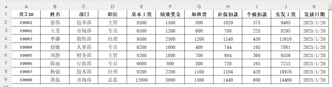 #输出员工ID 姓名 部门 职位 基本工资 绩效奖金 加班费 社保扣款 个税扣款 实发工资 发放日期0 E0001 张伟 技术部 主管 8500 1500 800 1020 375 9405 2025-01-201 E0002 王芳 市场部 专员 6500 1200 600 780 225 8295 2025-01-202 E0003 李娜 销售部 经理 9500 2500 1200 1140 450 11610 2025-01-203 E0004 赵敏 人事部 专员 6200 1000 400 744 195 7861 2025-01-204 E0005 刘静 财务部 主管 8200 1800 700 984 360 9356 2025-01-205 E0006 陈丽 行政部 专员 6000 800 300 720 165 7215 2025-01-206 E0007 杨强 技术部 经理 9200 2200 1100 1104 420 10976 2025-01-207 E0008 黄磊 市场部 总监 12000 3000 1500 1440 600 14460 2025-01-20