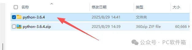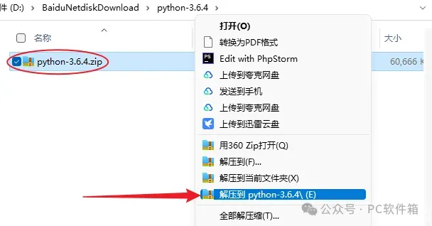 1.解压安装包:鼠标右击【python-3.6.4】压缩包,选择电脑上安装的解压软件,点击解压到【python-3.6.4】。