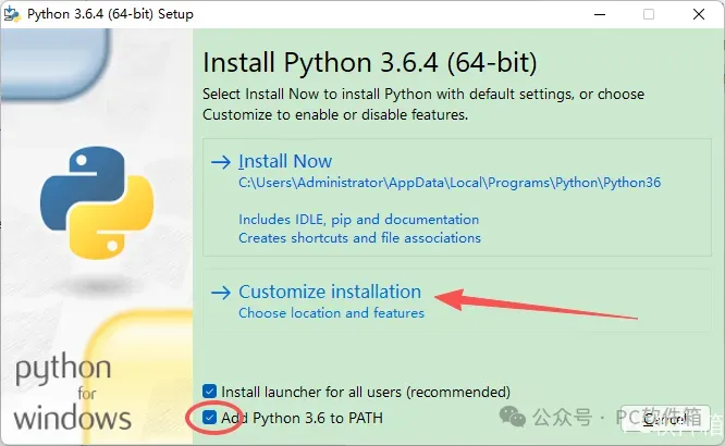 4.勾选【Add Python 3.6 to PATH】,点击【Customize installation】。