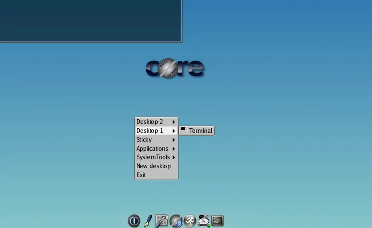 加载完成后,几秒内就完成了系统初始化进入桌面环境。桌面基本没有什么内容,底部的菜单有终端、编辑器、Apps也就是软件管理器、控制面板,其他几个用途不大,作为终端的可视化补充。