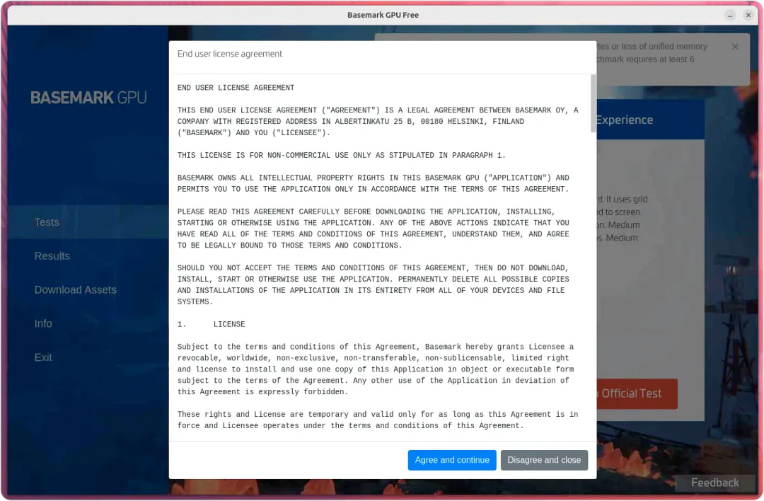 前往 【 显示应用 】 或点击显示应用程序,搜索 BaseMark GPU。找到后,点击运行。点击 【 Agree and continue 】同意用户协议以使用该软件在 Linux 上运行官方基准测试