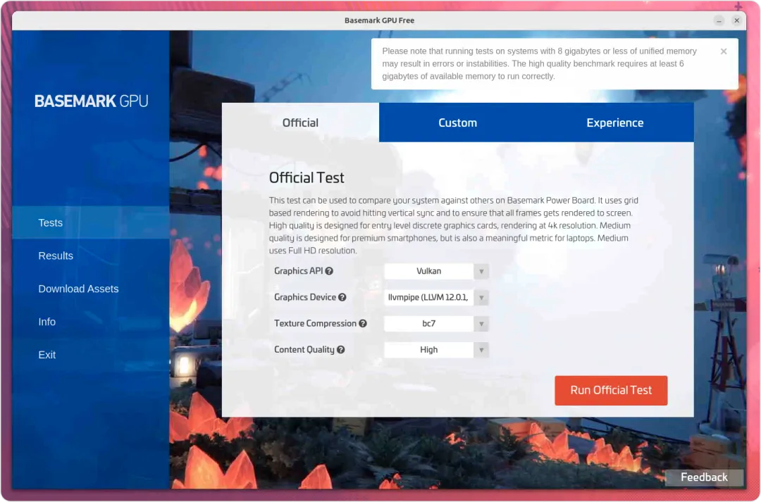 Basemark GPU 是一款用于 Linux 及其他操作系统的基准测试软件,用于测试系统中安装的显卡 GPU的性能。接下来,我们将了解在 Ubuntu 24.04 LTS Linux 上安装它的简单步骤。对于跑分爱好者来说,简直就是福音对于游戏玩家来说,“Basemark GPU” 可以在运行 Linux 的 PC 上测试图形性能。它支持多种图形接口,如 DirectX 12、OpenGL 或 Vulkan。使用它可以测量内置图形芯片的性能,并与其他用户的数据进行比较。测试结果会自动存储到在线数据库中。安装 Benchmark GPU 工具非常简单,设置完成后,只需运行测试,该基准测试软件将给出一个有意义的分数。在运行基准测试软件时,请确保关闭所有其他应用程序,并且不要在电脑上进行任何操作。在 BaseMark 的 “CustomTest” 设置中,可以调整详细设置,例如分辨率和使用的纹理压缩。除了自定义设置外,还有 “Experience Mode”,它将在全屏显示上运行基准测试。但是,Basemark GPU 的免费版本在结果细节方面存在一些限制,也无法自动化测试,但对于家庭用户来说,仍然有足够的细节来了解他们的 GPU 性能。在 Ubuntu 24.04 Linux 上安装 Basemark GPU Benchmark
